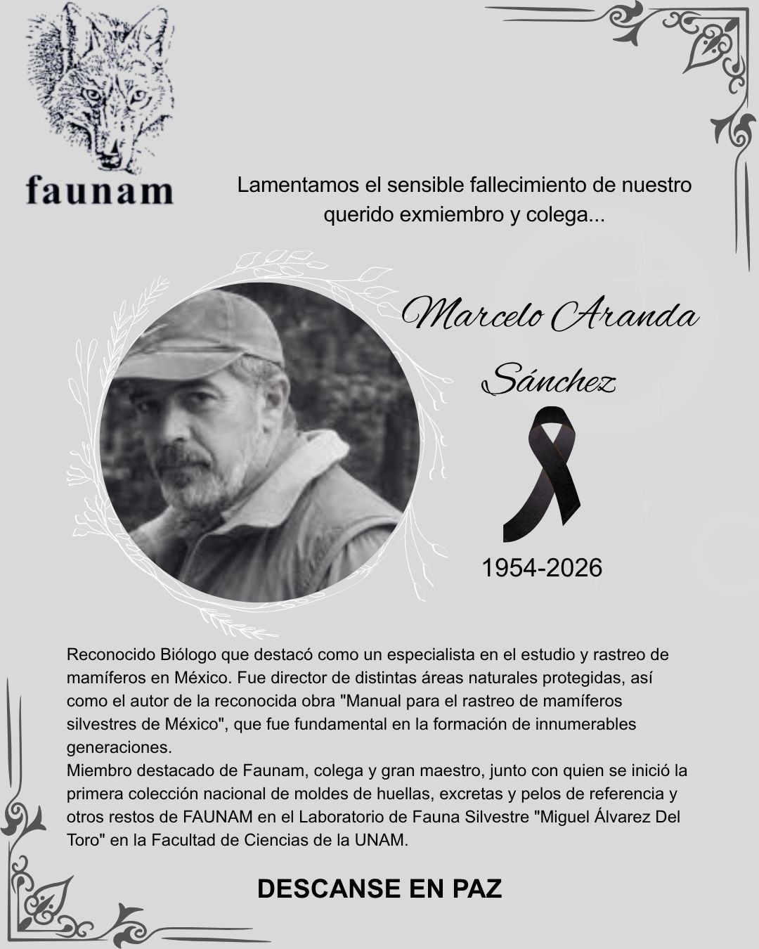 Conoce más acerca de su legado a través de su Manual para el rastreo de mamíferos silvestres de México. Una obra en la cual combino su pasión por el rastreo, la ilustración y la fotografía. Convirtiéndola en una herramienta indispensable para conocer diversos aspectos de la biología de los mamíferos silvestres.